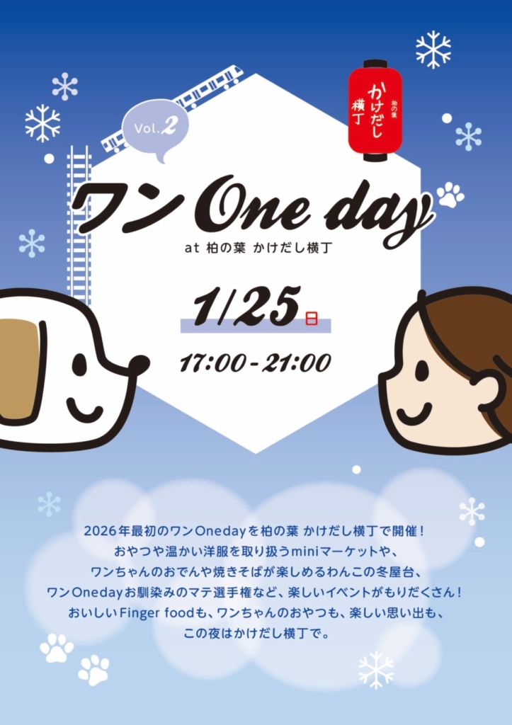 【ワンOneday at 柏の葉かけだし横丁 Vol.2】開催のお知らせ(1月25日(日) 17:00~21:00)
